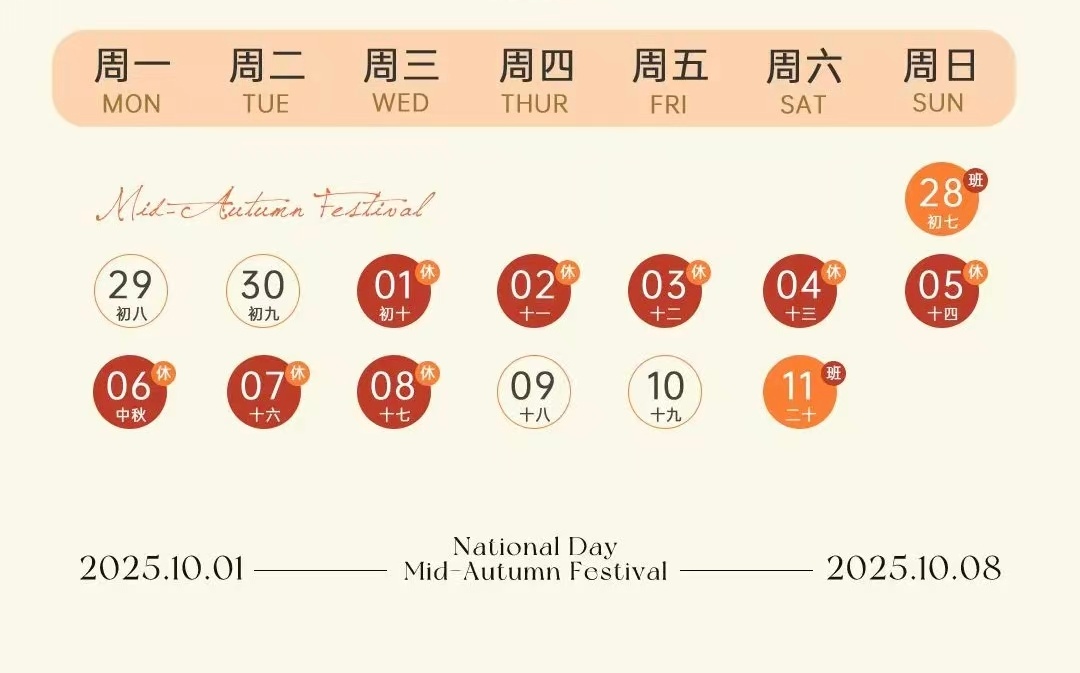 Bitte beachten Sie, dass Shenzhen Smart Connection Technology Co., Ltd. wegen der Feiertage zum Nationalfeiertag und Mittherbstfest vom Mittwoch, 1. Oktober 2025, bis Mittwoch, 8. Oktober 2025Wir werden den regulären Geschäftsbetrieb am wieder aufnehmen Donnerstag, 9. Oktober 2025.